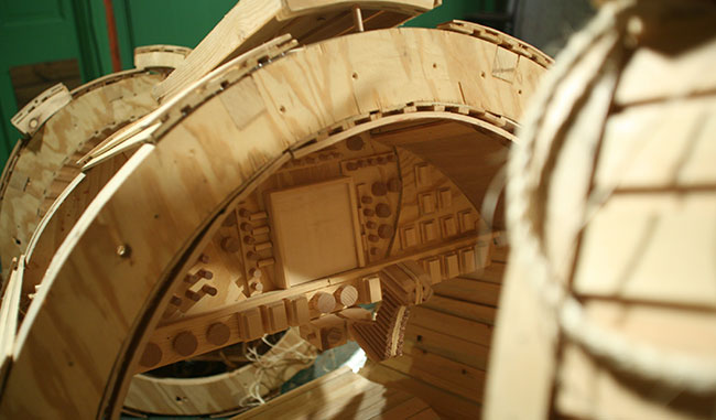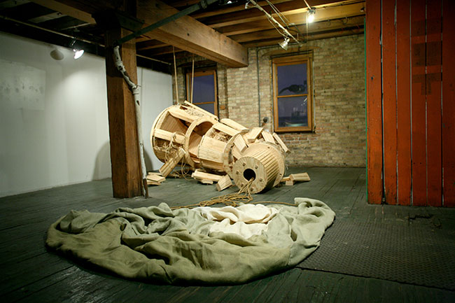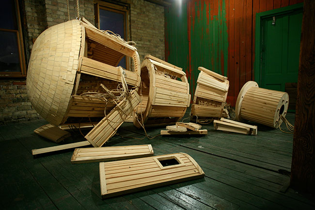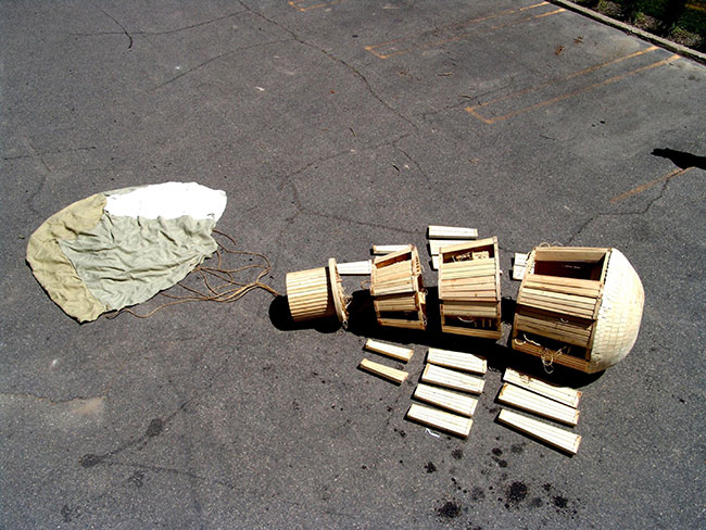 Send A Monkey to Space If Remo Williams Can Not Do It 2004 wood, burlap, pink-foam, rope, intercom, when paired with Who Knew Starman Would Answer Back (sister piece of capsule) capsule could receive/transmit messages